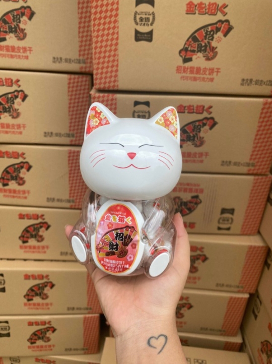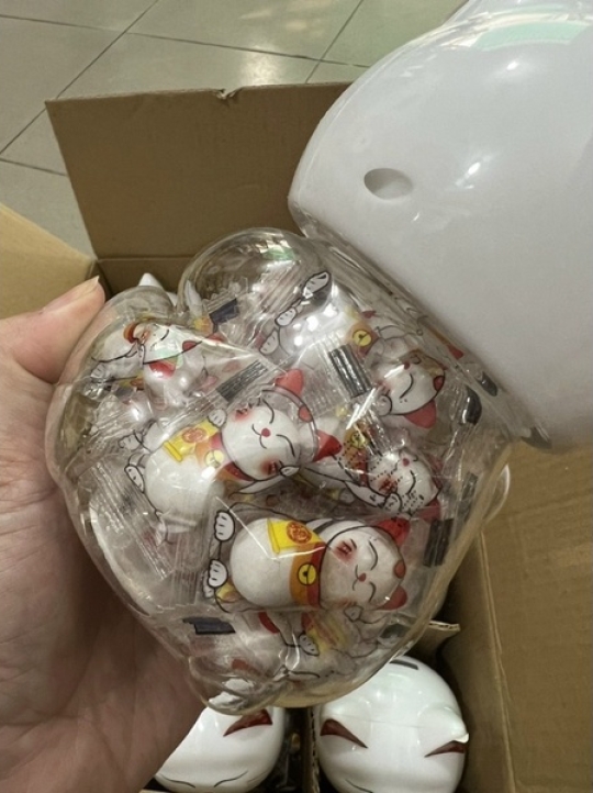Kẹo socola mèo thần tài được bọc trong lớp vỏ cứng có in hình chú mèo dễ thương bên ngoài, bên trong có 2 viên kẹo socola trắng sữa rất thơm ngon, là món quà rất ý nghĩa cho dịp tết đến xuân về ạ